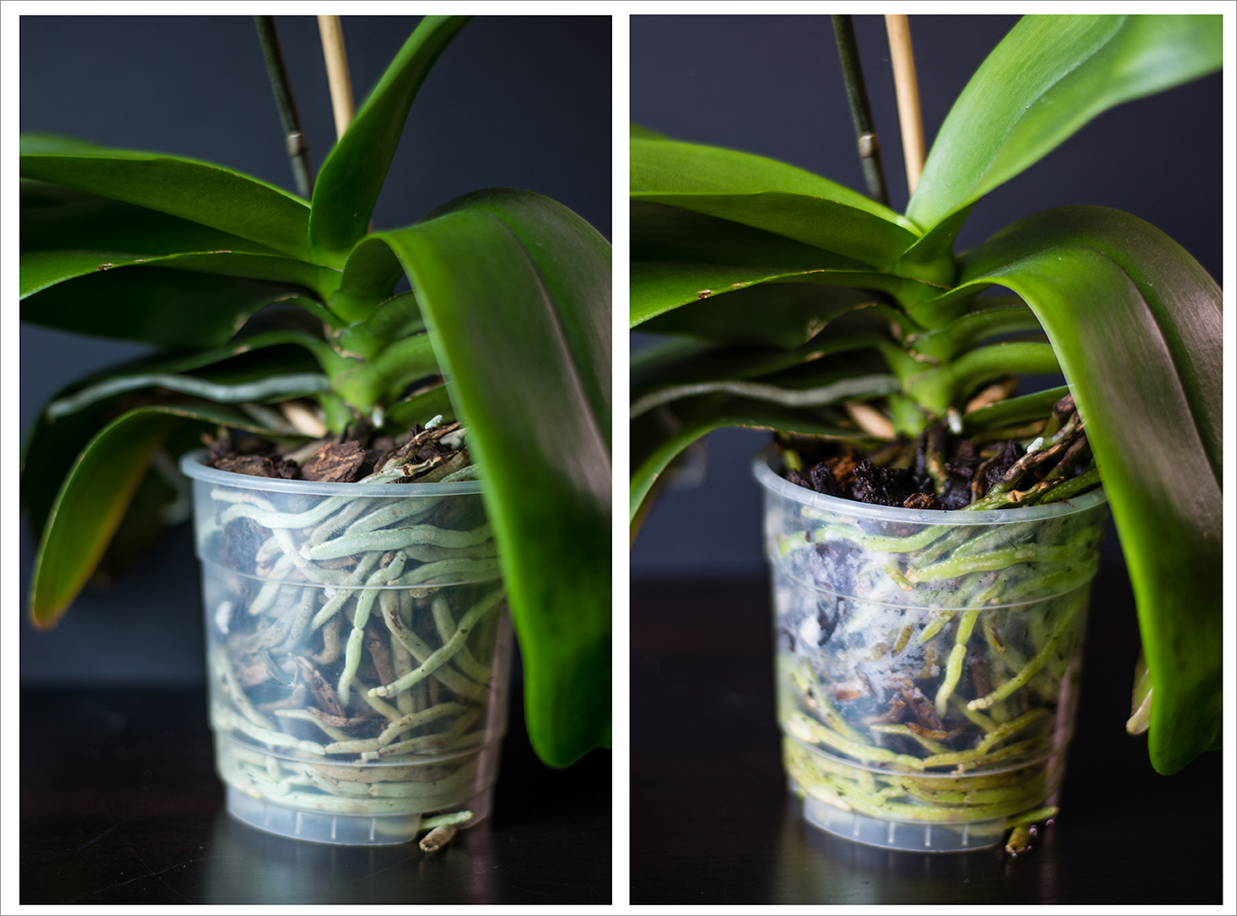 - Корни изменили цвет — здоровые влажные корни имеют зеленый цвет, сухие становятся серебристо-белыми