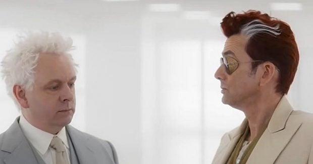 Дэвид Теннант, известный по таким сериалам как "Доктор Кто", "Бродчорч" и "Джессика Джонс", и Майкл Шин, который запомнился в фильмах "Другой мир", "Фрост против Никсона" и "Ночные звери", исполнили главные роли в шоу. Финальная серия "Благие знамения" будет показана 13 мая 2026 года.