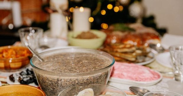 В меню на Рождество предусмотрены 12 традиционных блюд, таких как кутья, узвар, жареная рыба, винегрет, вареники (с картофелем, капустой и вишнями), тушеная капуста, постный борщ с фасолью, жареный картофель, а также свежие и соленые овощи.