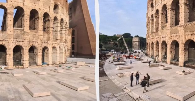 Во время обновления Колизея, символа Рима, была проведена замена старинной брусчатки на гладкие белые мраморные полы и скамейки вдоль южной стены. В публикации The Times отмечается, что новый дизайн, хотя и выглядит современно, на самом деле призван напомнить о величии древнего памятника, который существовал до обрушения большей части его внешнего кольца в результате землетрясений 847 и 1349 годов.